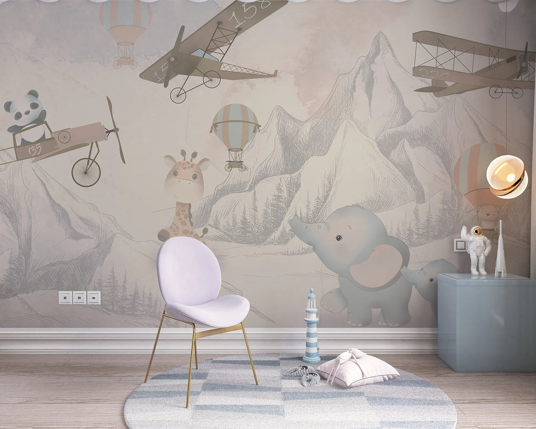 Adventure meets cuteness in this sky-high safari scene. Friendly animals fly over sketch-style mountains in...