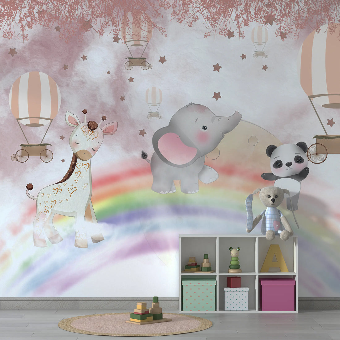 Take a magical ride through the clouds with adorable safari animals floating in hot air...