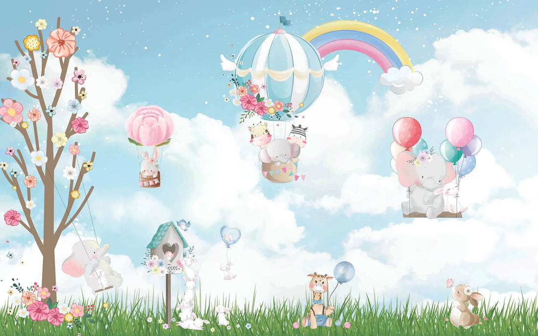 Float into a cheerful sky filled with baby animals in hot air balloons, fluffy clouds,...