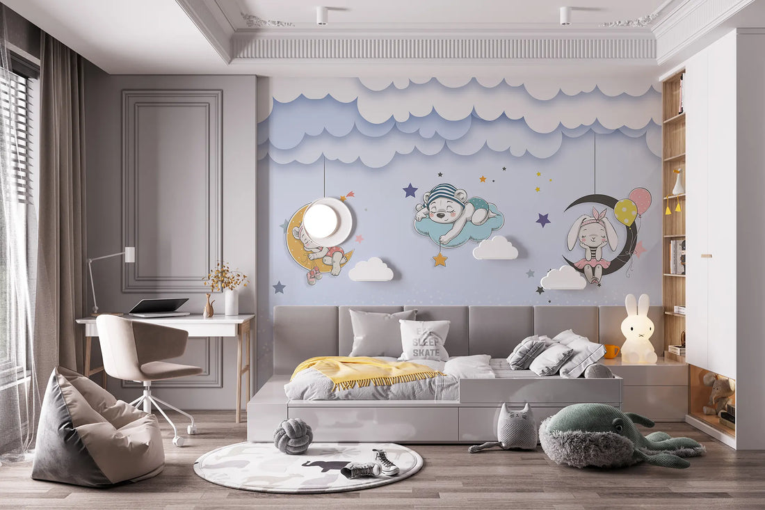 Adorable baby animals resting on clouds and crescent moons create a cozy bedtime theme. With...