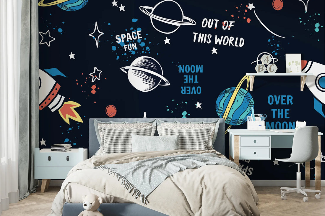 Fun rockets, planets, stars, and playful space phrases create a bold and modern pattern. The...