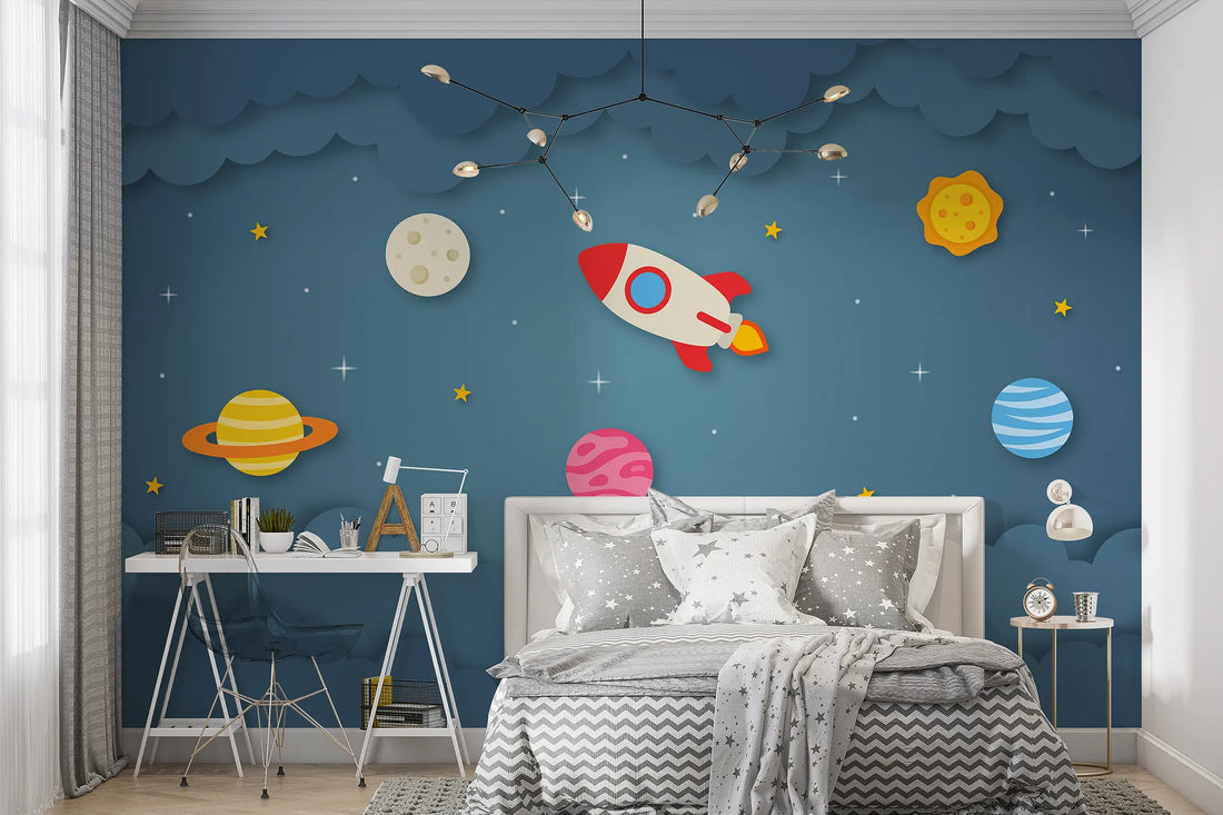 Blast off into imagination with this playful space wallpaper featuring rockets, planets, stars, and constellations...