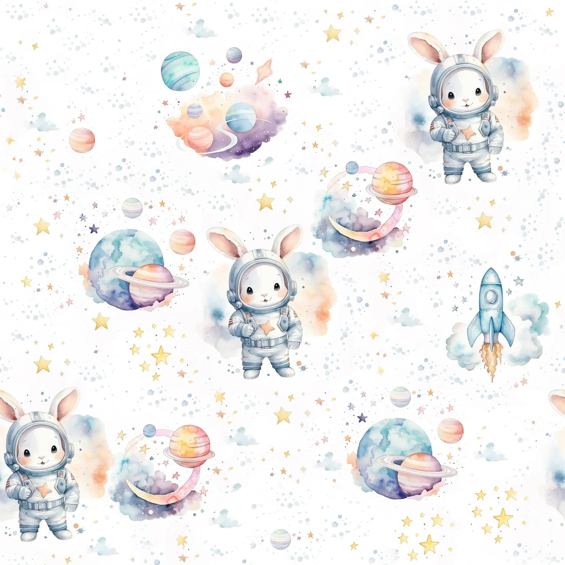 Sweet little bunnies dressed as astronauts explore a dreamy galaxy of watercolor planets and stars....