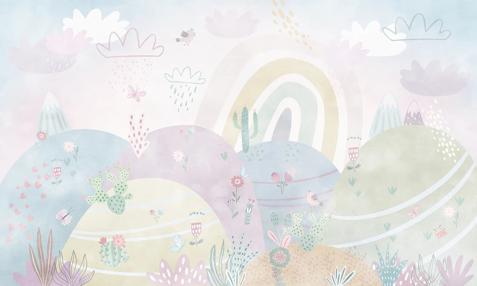 A peaceful valley of hand-drawn wildflowers and gentle hills brings warmth, softness, and free-spirited bohemian charm to any room.