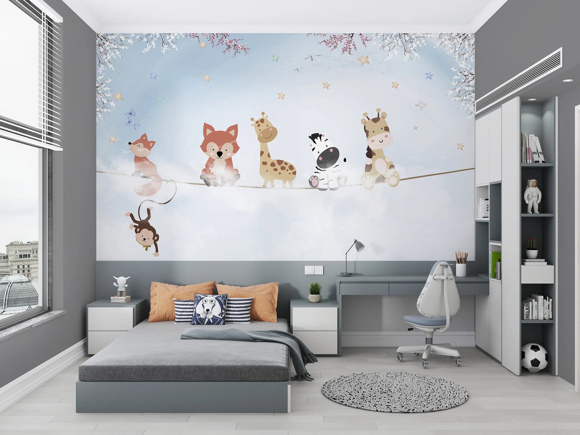 A cheerful and playful wallpaper featuring adorable animals sitting on a rope in the sky, surrounded by soft clouds, stars, and gentle pastel tones. With smiling foxes, giraffes, zebras, and monkeys, this design brings joy and friendliness to kids’ bedrooms and play areas. Perfect for creating a lively yet soothing environment where imagination and happiness grow together.