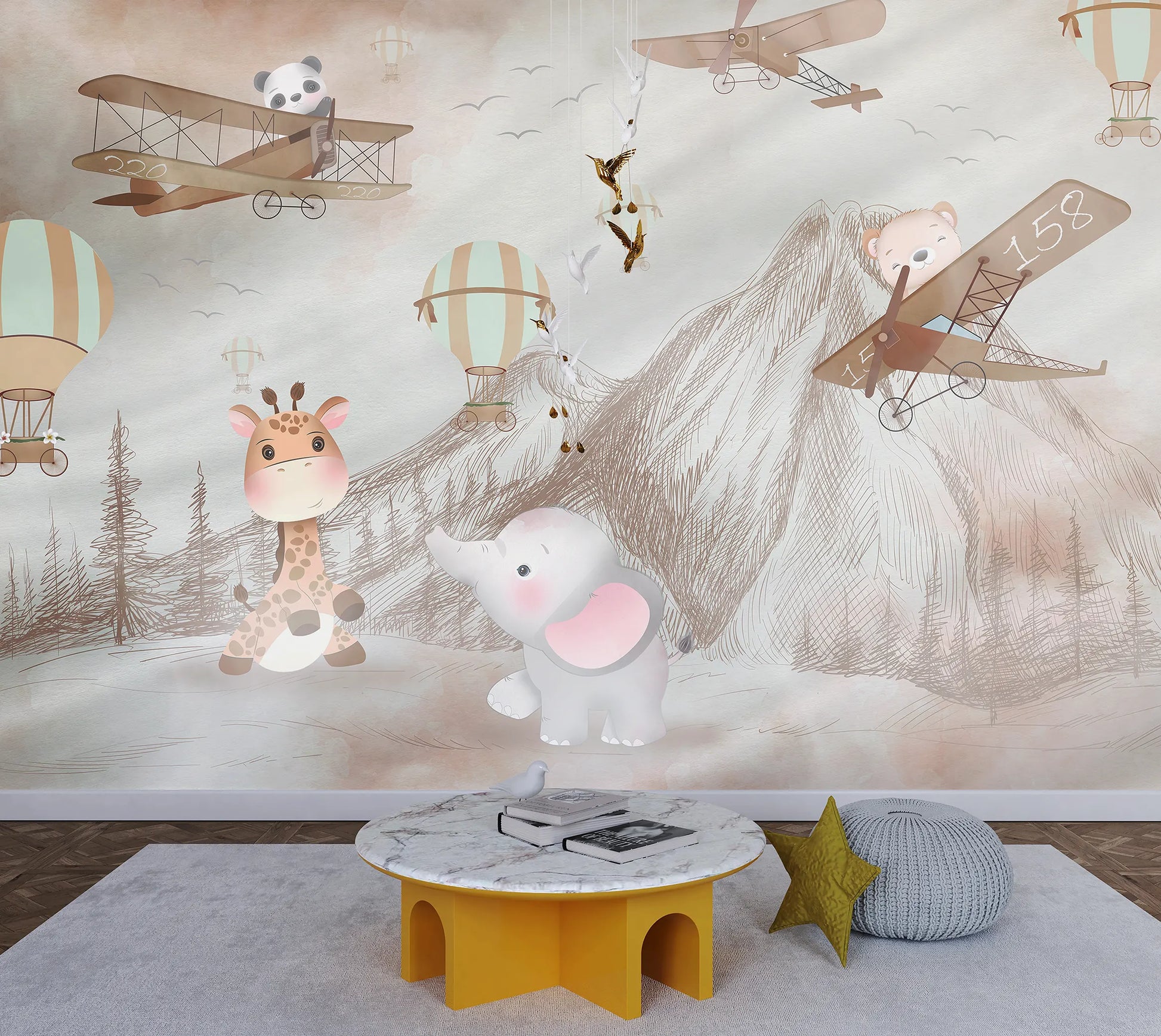Adventure meets cuteness in this sky-high safari scene. Friendly animals fly over sketch-style mountains in vintage planes and balloons, creating a storybook world full of imagination. Perfect for kids who love animals and travel-inspired themes.