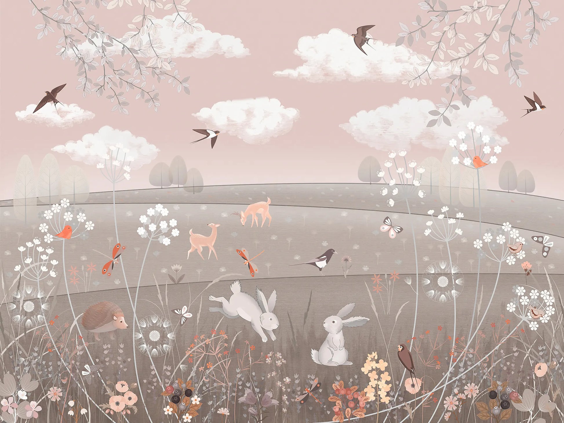 Gentle forest animals explore a dreamy meadow filled with flowers, butterflies, and soft pink skies. The muted earthy tones and delicate details create a calming yet whimsical atmosphere, ideal for cozy nurseries and nature-inspired kids’ rooms.