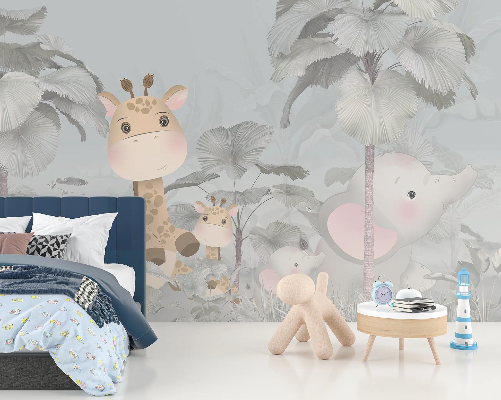Friendly giraffes and elephants explore a soft pastel jungle filled with large tropical leaves and dreamy misty layers. The gentle color palette keeps the room feeling airy and spacious while still playful. Perfect for modern kids’ bedrooms with a love for animals and nature.
