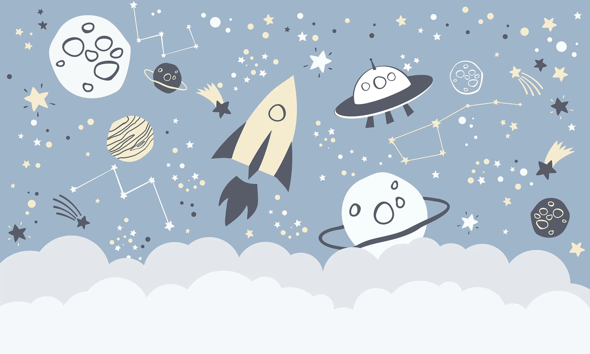 Blast off into imagination with this playful space wallpaper featuring rockets, planets, stars, and constellations floating above soft clouds. The calming blue background and cute hand-drawn style make it perfect for kids' bedrooms, nurseries, and playrooms. This design creates a dreamy sky full of adventure while still feeling soft and child-friendly.